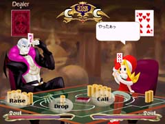 もしも相手がレイズをしてきたら左のような画面になります。自分はCall,Drop,Raiseから行動を選択できます。 Callは相手の賭け金と同じ額で勝負。 Dropは場に出ているチップを支払う代わりに降りる。 Raiseは更に上乗せします。 ただしRaiseは上乗せできる額を持っているか、その回の勝負でRaiseを使っていないことが条件です。 |