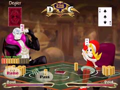 お互いに相手のカードを見てチップを賭け合います。 指示の仕方は画面下のPassやRaiseのボタンをクリックします。 |