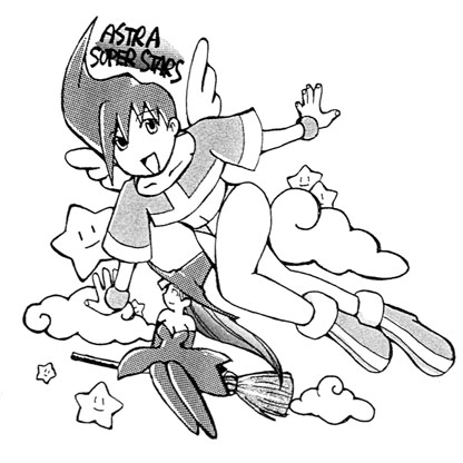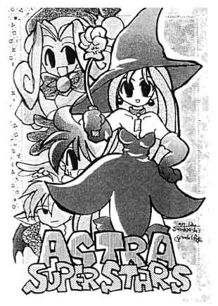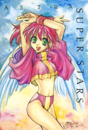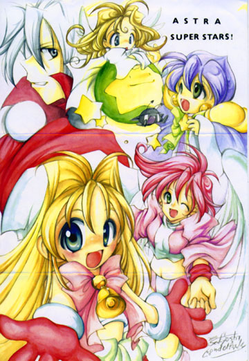 ゲーメスト、アルカディア誌に投稿したアストラ イラストの複製をたくさん頂きました。 同封のアストラ普及協会会報も、アストラ企画づくし。 今回は、ゴンドルフさんのイラストの一部をご紹介します。 雑誌ですでにご覧になった方も、はじめての方も、 スペースいっぱいに広がる元気絵をお楽しみください。 |