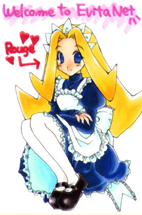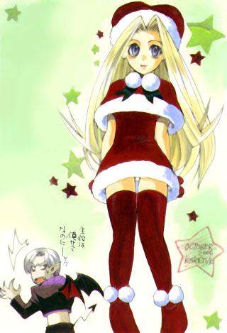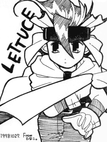 アストラ本「HAPPY MAKER」にも執筆されていた下下ABさん。 <左>みっちさんあてに頂いていたキュープとサカモト。 迫力の逸品です。夏の暑さを名残り惜しむ人に最適です。(37KB) <右>ウサギフーリーと部下3人&バニールージュの、とっても素敵なフルスカルテ壁紙です。 どうもありがとうございます〜!この愛らしさをごらんあれ。 左へリンクした画像はプレビュー用に縮小編集されたものです。 壁紙サイズはこちらからどうぞ。 →1125*870 pixel (128KB) →800*600 pixel (82KB) Windowsの方は、BMP形式で保存しなおしてからお使いください。 |